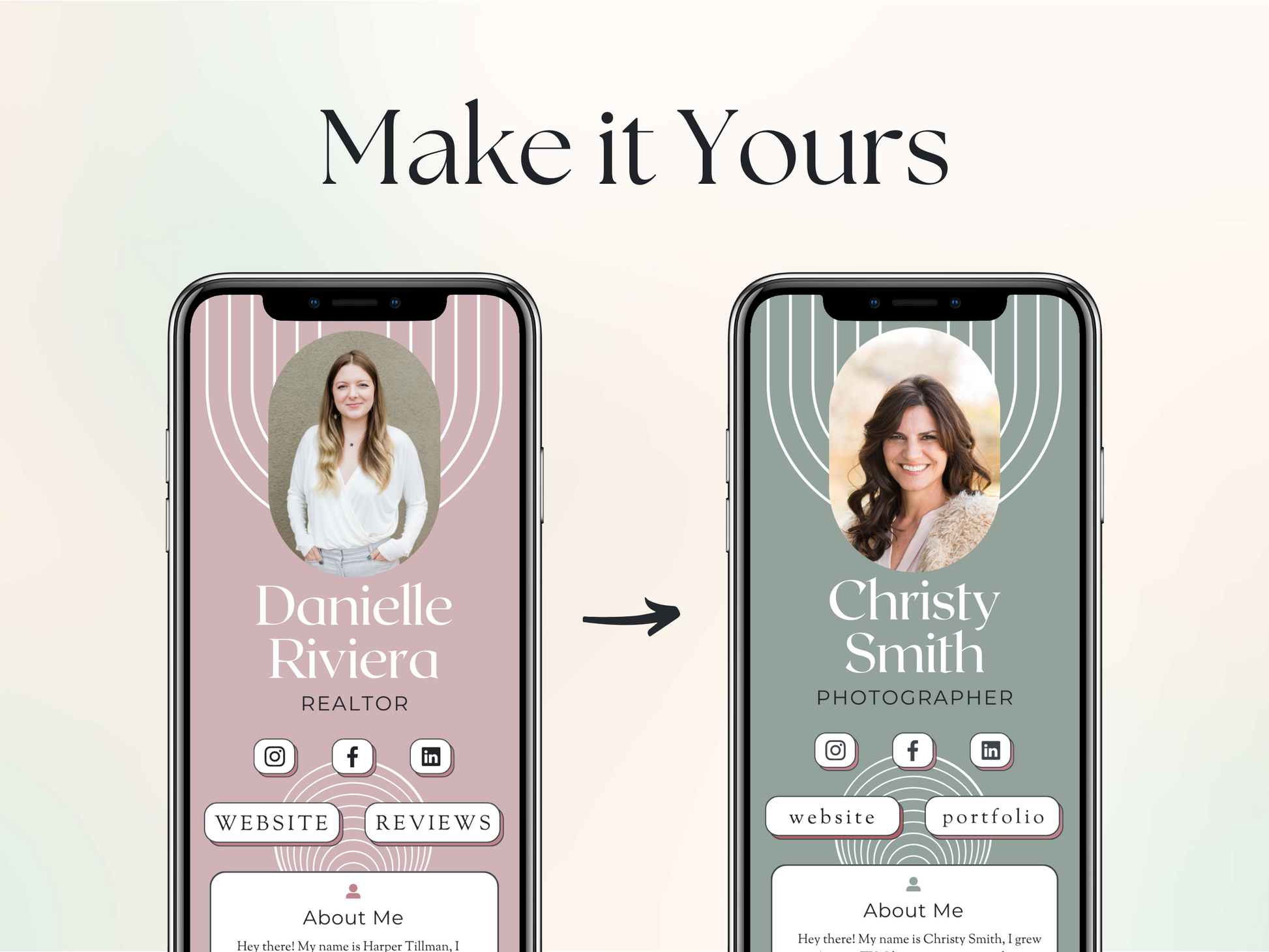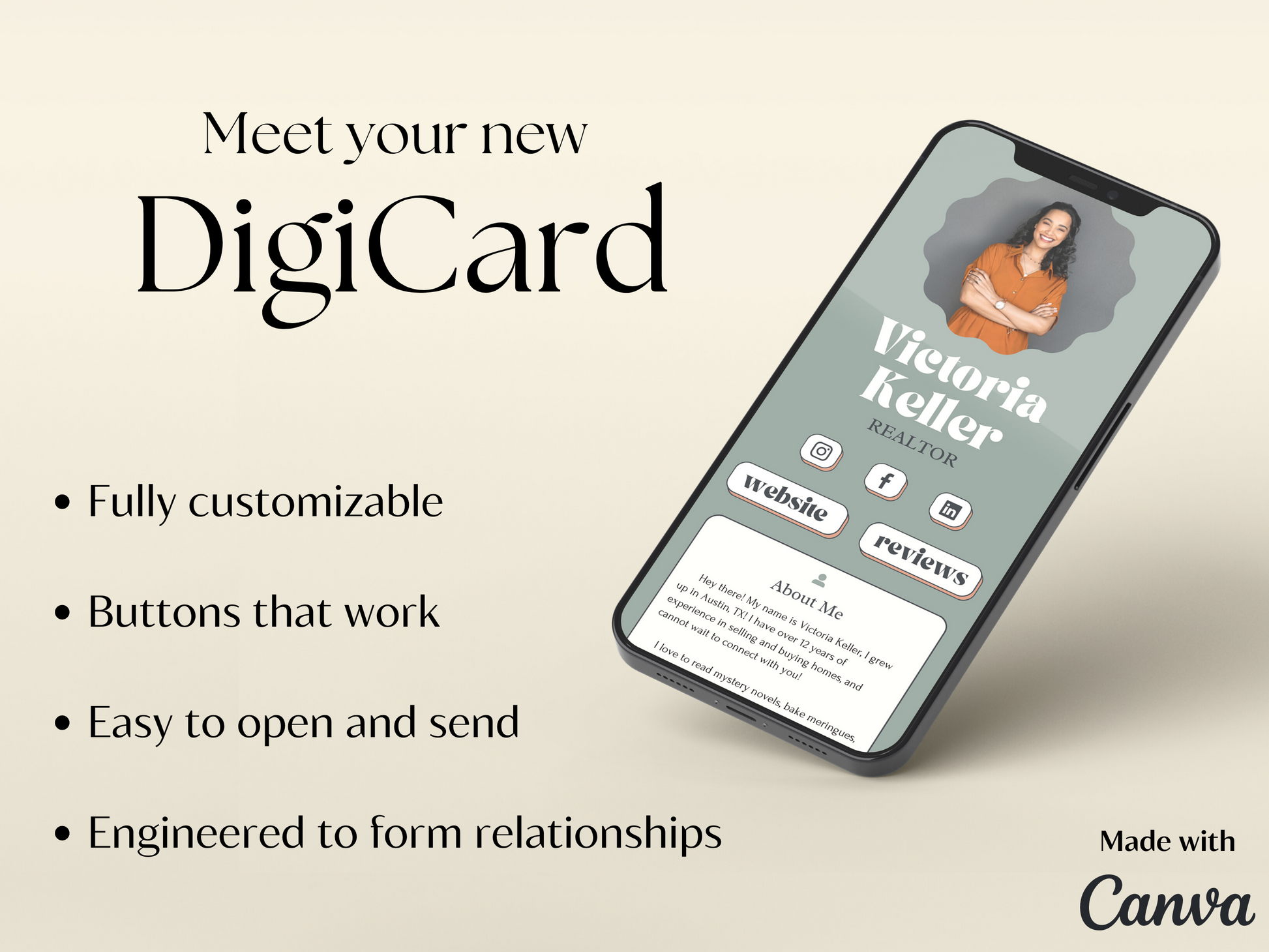 Design your new DigiCard in under 20 minutes! Once you purchase, you will download a PDF that will have a link to your editable Canva Template (yours forever). Create a FREE Canva account if you don't have one. Then edit your about page, links to certain webpages, or even the colors and fonts if you choose. Then save your PDF DigiCard to easily AirDrop, iMessage, or email!