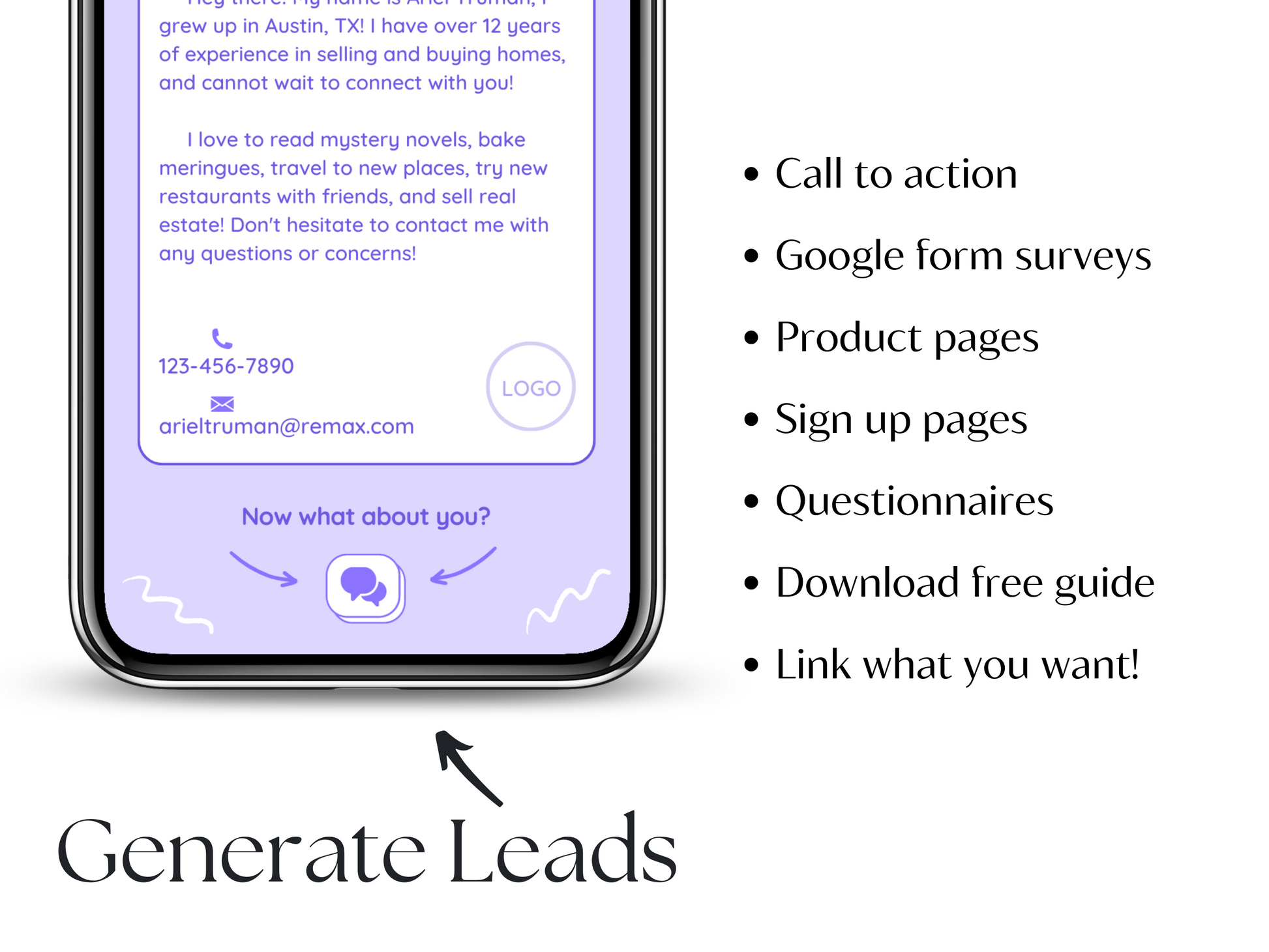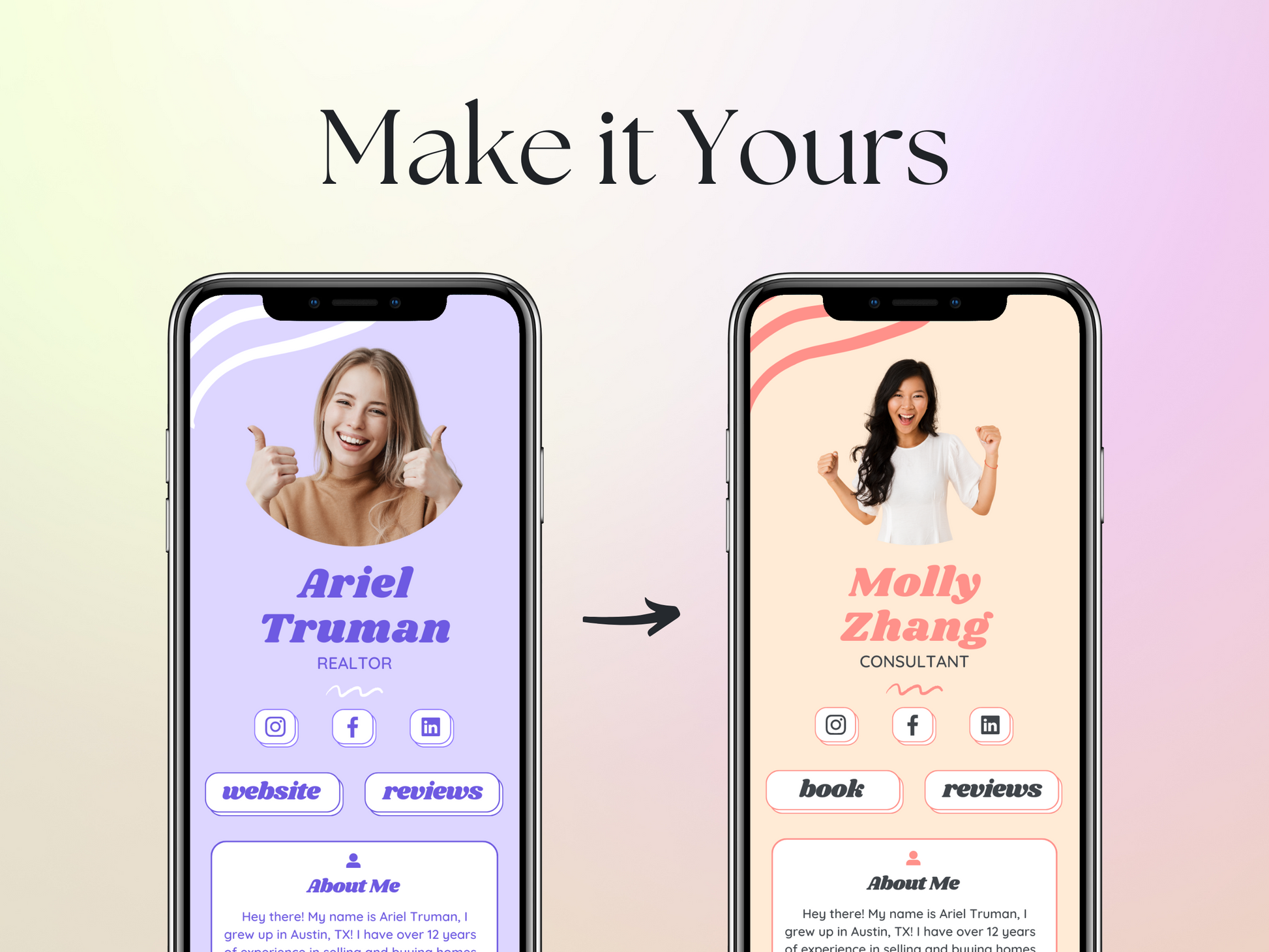 Design your new DigiCard in under 20 minutes! Once you purchase, you will download a PDF that will have a link to your editable Canva Template (yours forever). Create a FREE Canva account if you don't have one. Then edit your about page, links to certain webpages, or even the colors and fonts if you choose. Then save your PDF DigiCard to easily AirDrop, iMessage, or email!